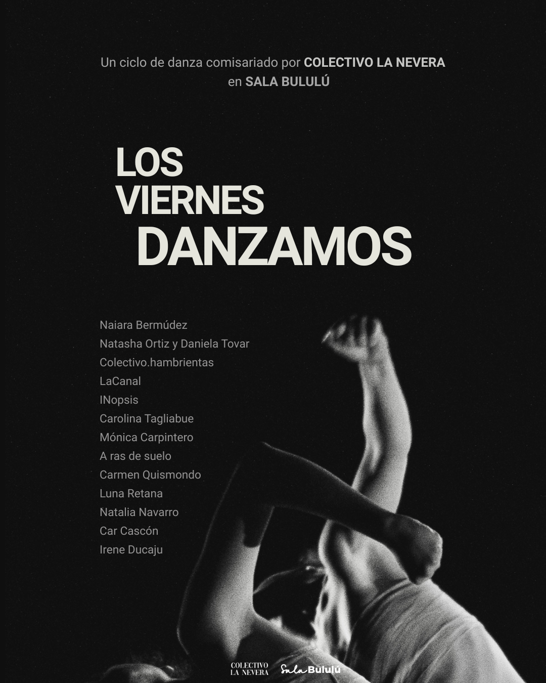 Los viernes danzamos es un nuevo festival de danza nacido de la colaboración entre Colectivo La nevera y Sala Bululú, donde cada mes varias compañías invitadas toman la sala para sacudir el cuerpo, el espacio y las emociones.